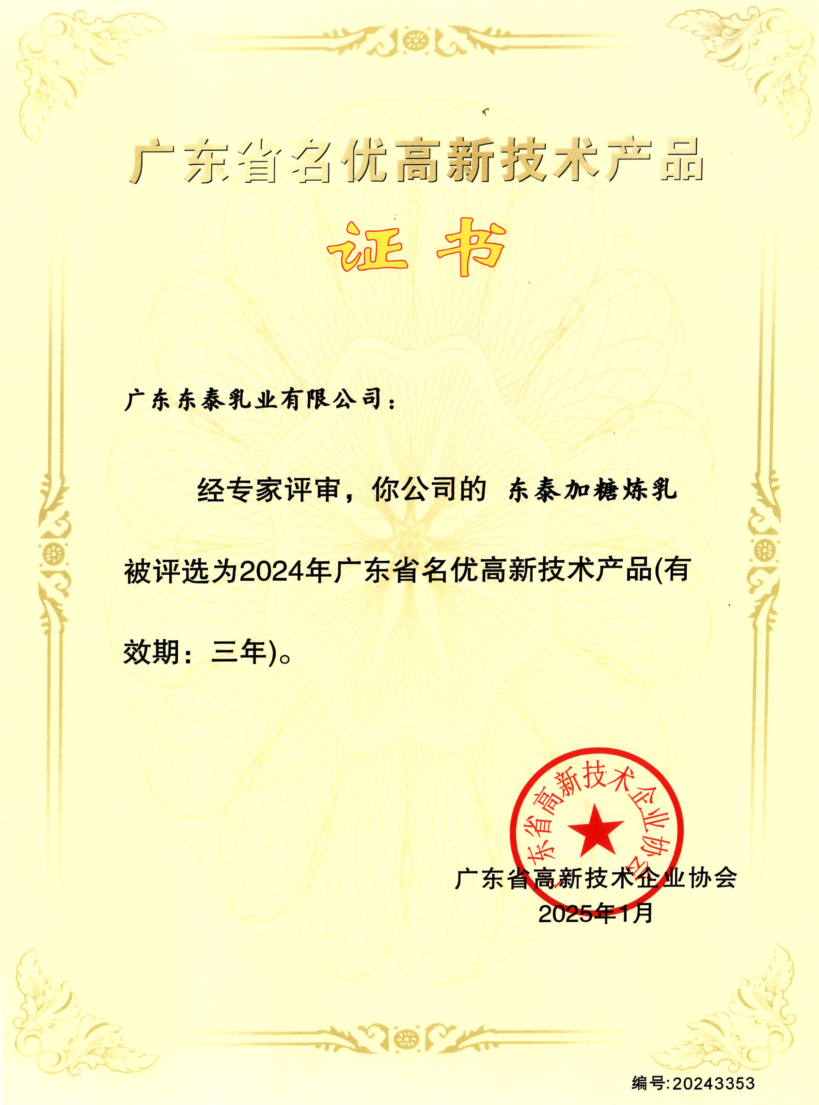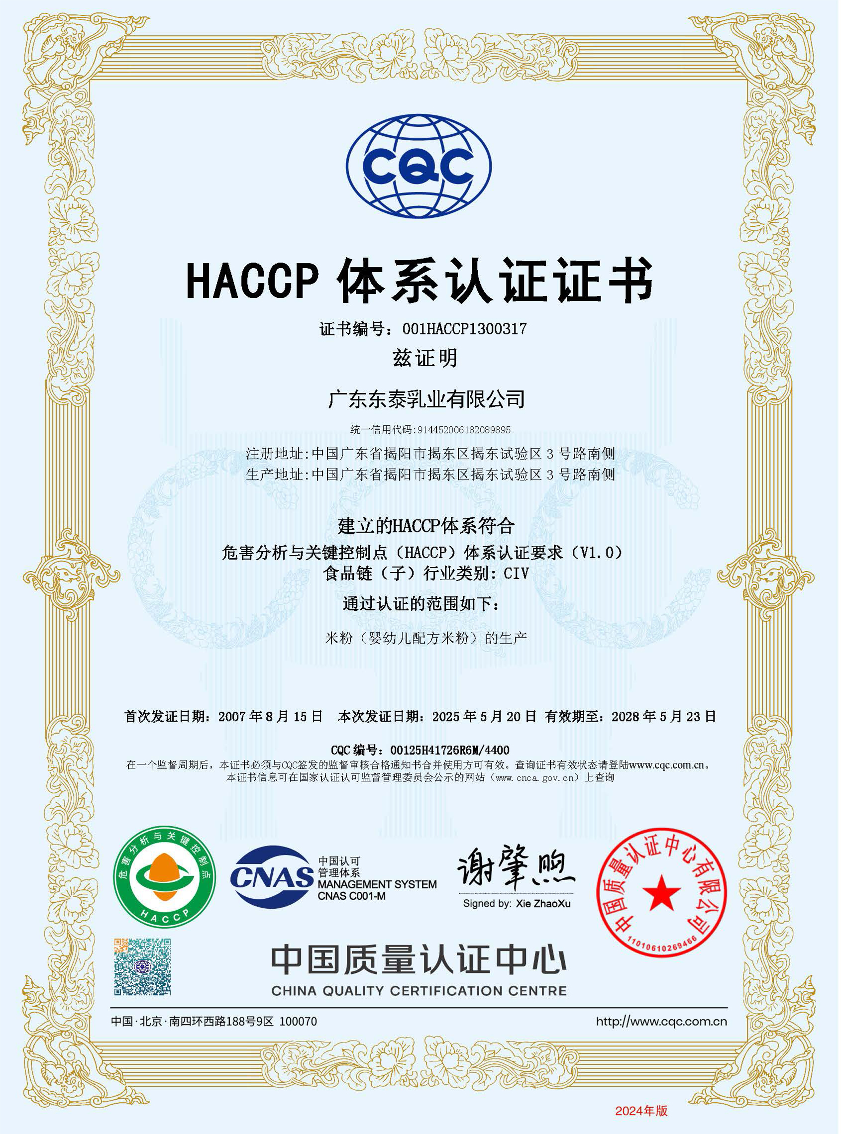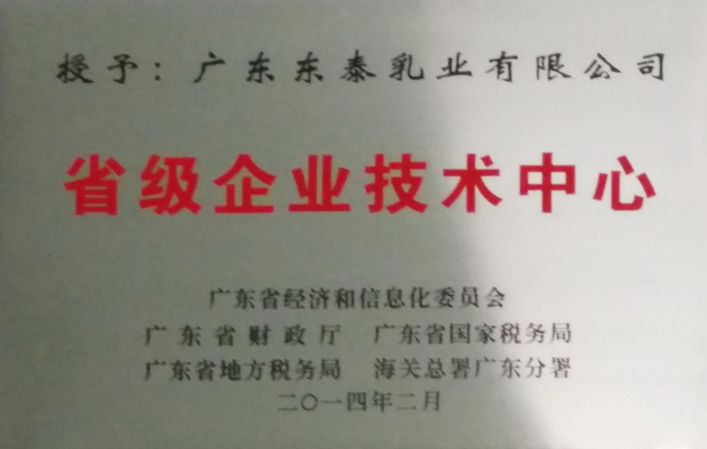 广东东泰乳业有限公司先后取得食品安全(haccp)质量控制体系和iso9001(2015版)质量管理体系双认证,并荣获高新技术企业称号;