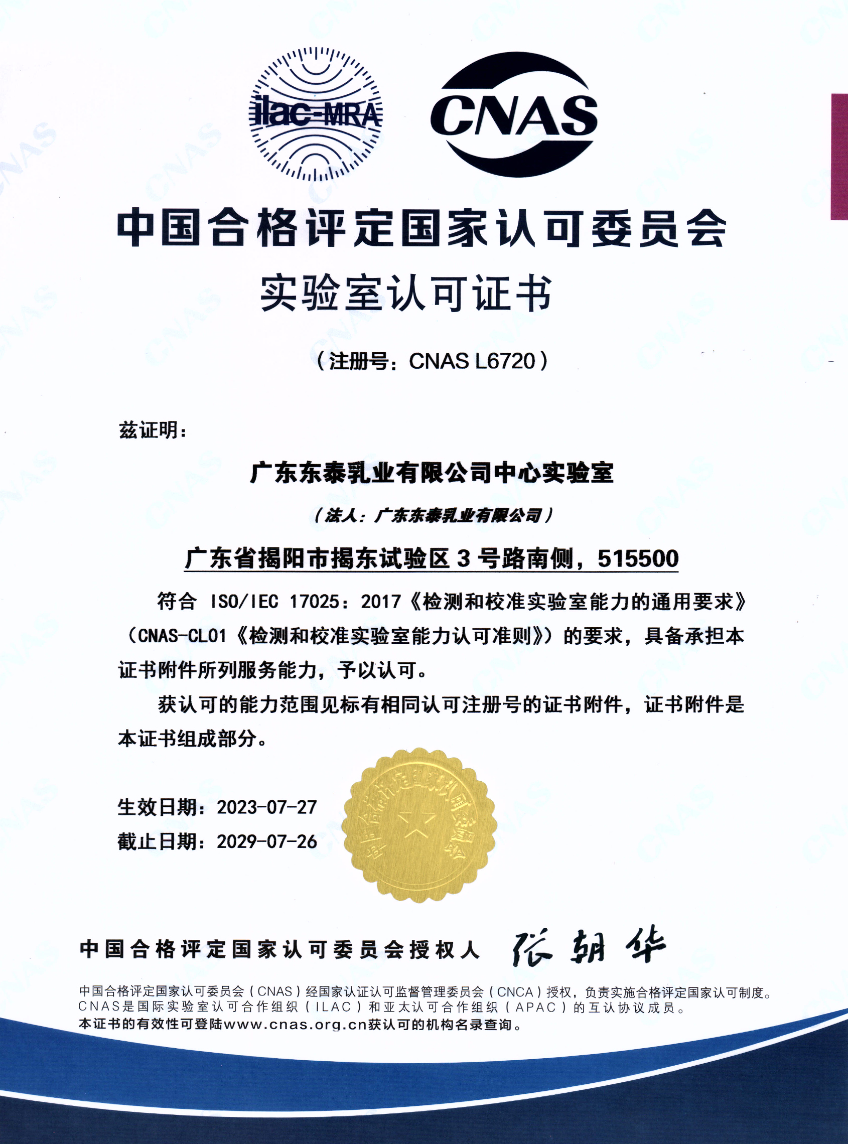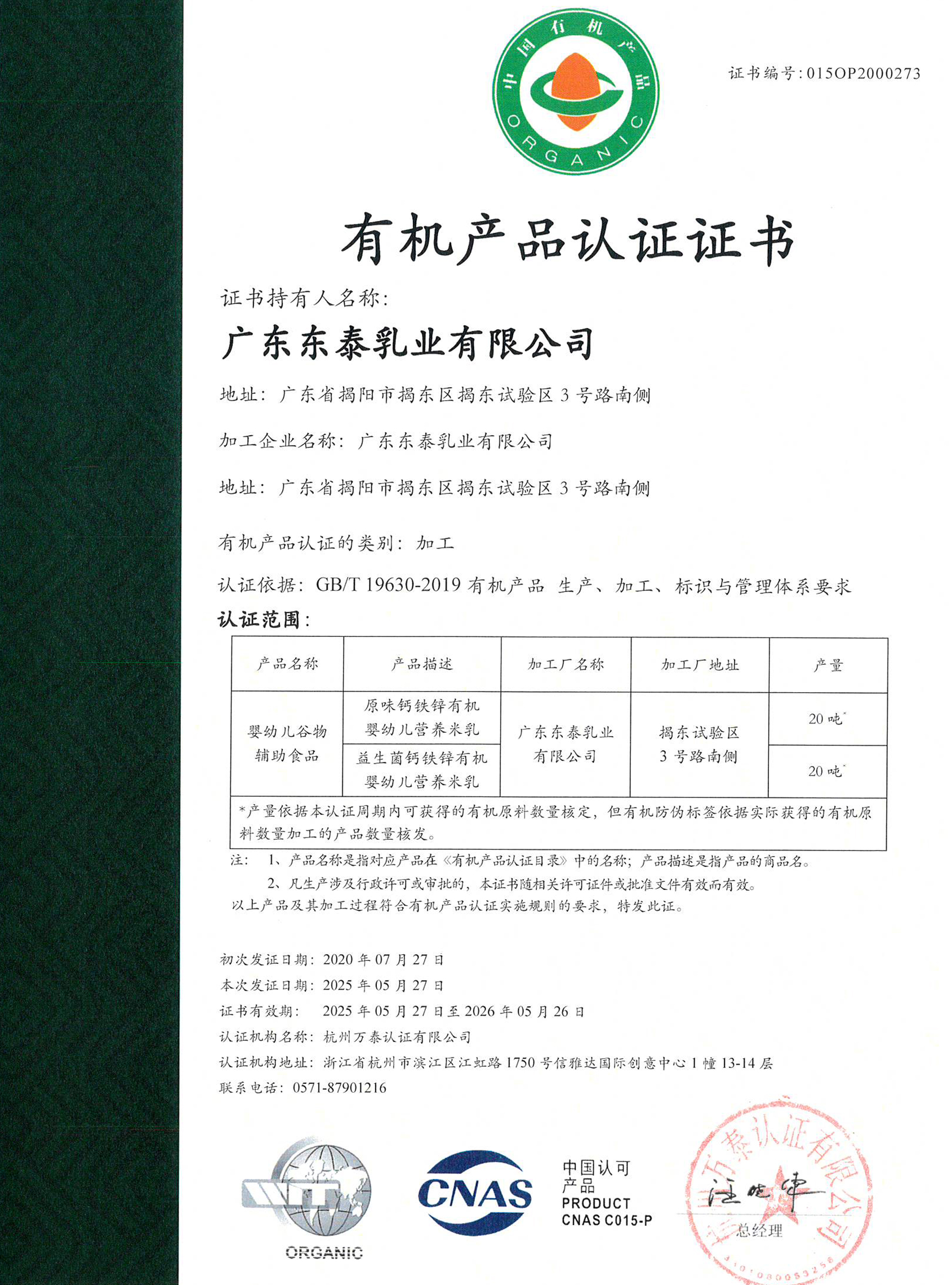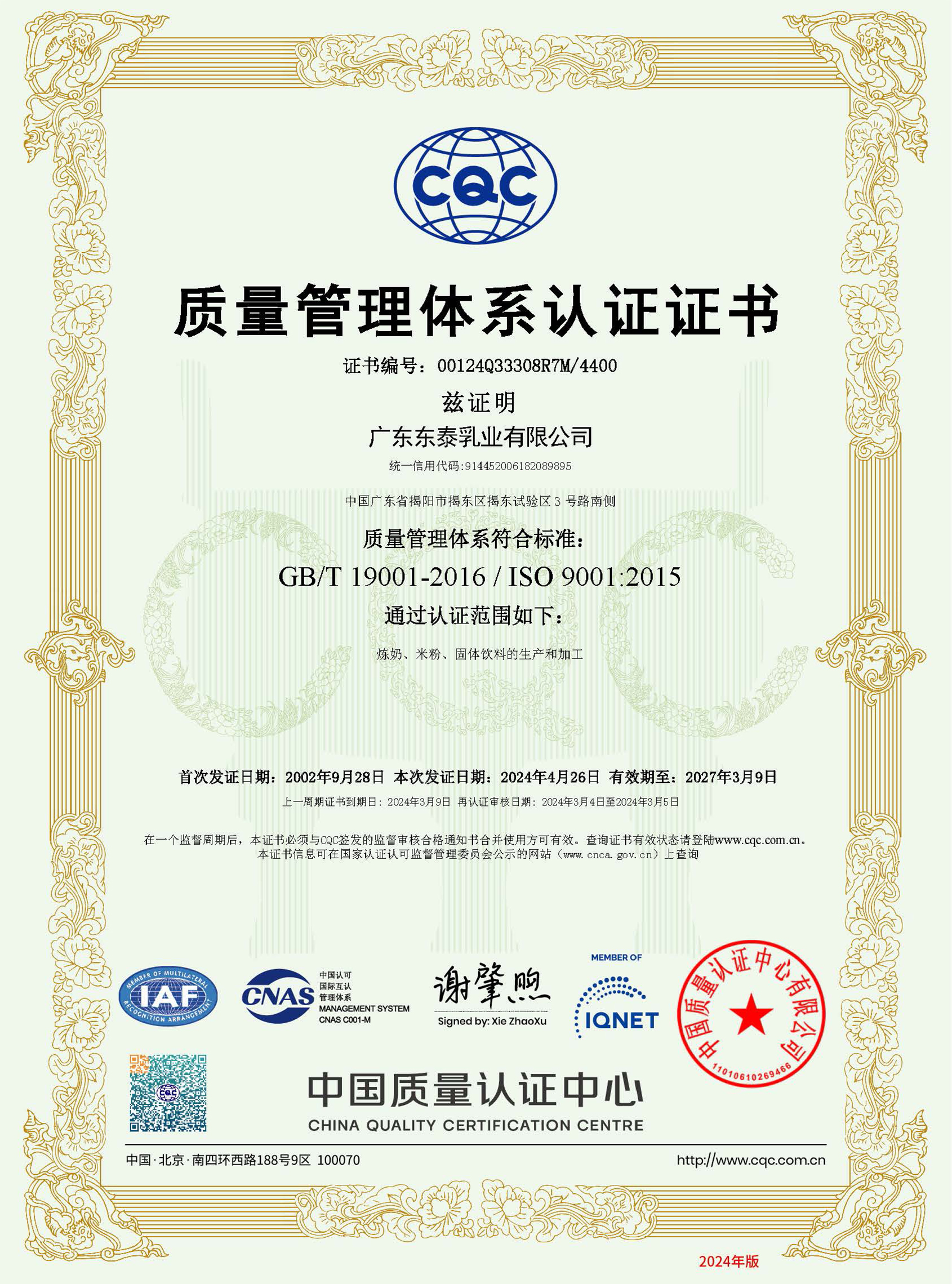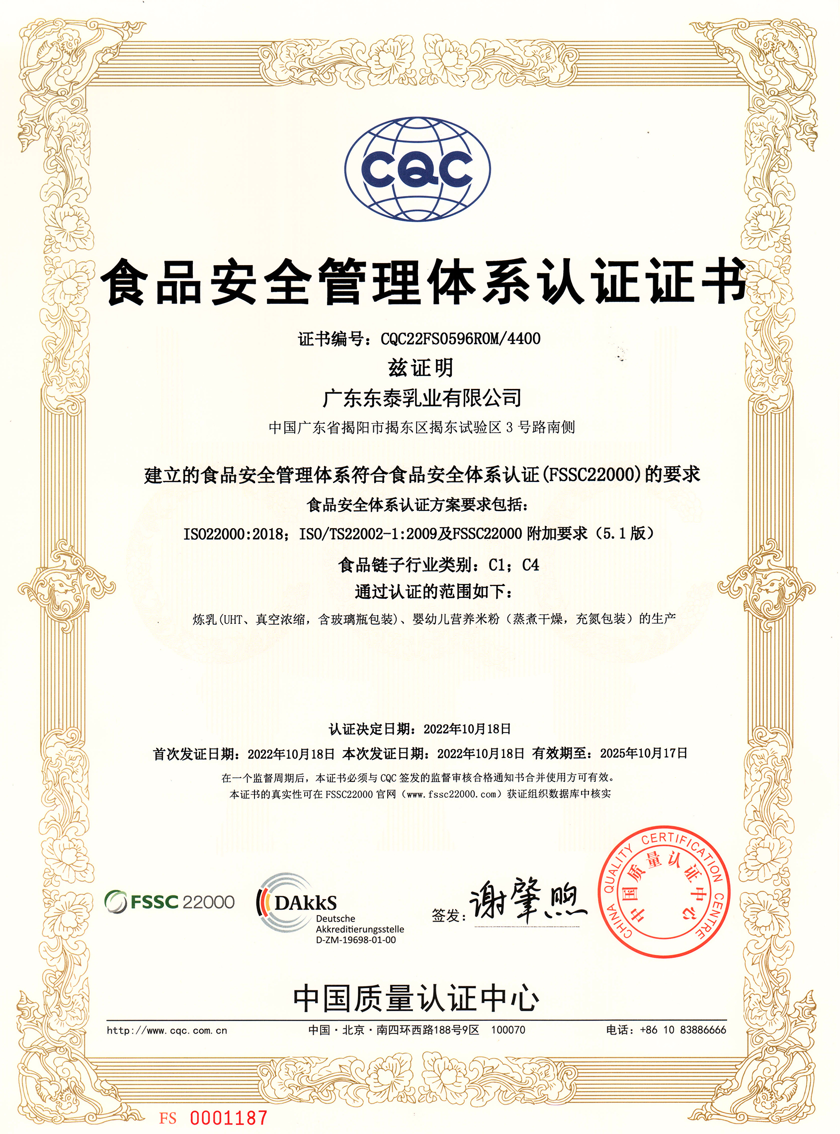 广东东泰乳业有限公司先后取得食品安全(haccp)质量控制体系和iso9001(2015版)质量管理体系双认证,并荣获高新技术企业称号;